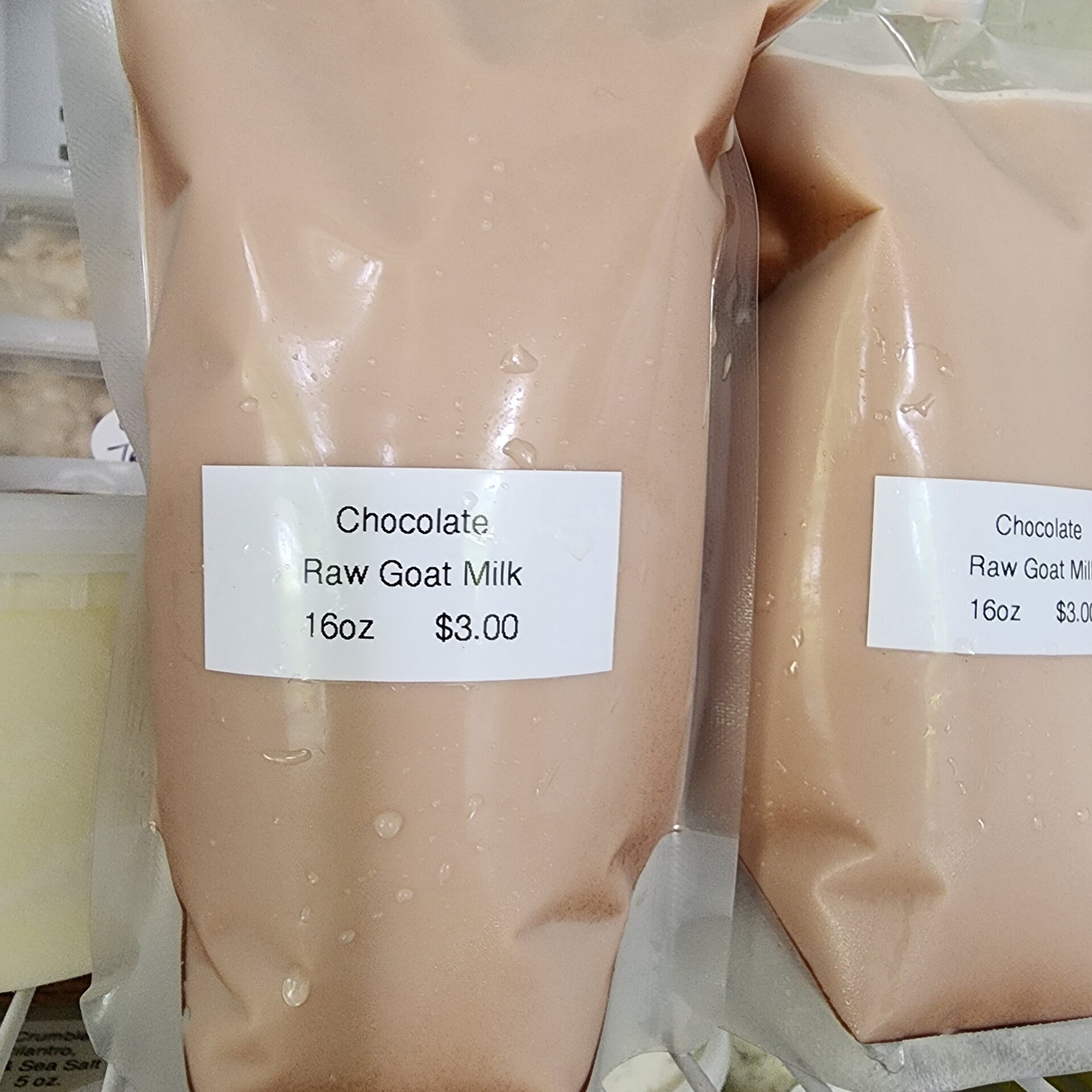 Chocolate raw goat milk! Yep, that's what it says and it's frozen in a squeeze pack for whenever you are ready for some yummy chocolate milk! Also available in 1 gallon now, because it's so good (for your pets of course, jk)! ;)